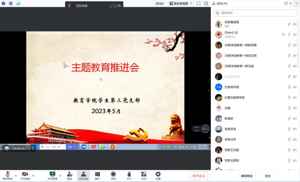 2023年5月10日晚,yL23411永利集团学生第三党支部召开学习贯彻习近平新时代中国特色社会主义思想主题教育推进会。学生第三党支部支部书记张玉同志主持会议并作动员讲话,强调开展学习贯彻习近平新时代中国特色社会主义思想主题教育是党的二十大作出的重大部署,全体党员要坚持学习贯彻习近平新时代中国特色社会主义思想,坚决按照学校、学院党委要求,切实开展主题教育,深刻认识开展主题教育的重要意义,准确把握主题教育的目标要求,力争通过理论学习、调查研究、学习探讨、微党课宣讲等方式,深化支部党员对“强国有我,请党放心”的认识与实践,不断坚定信仰、主动担当、提升本领、追求卓越。