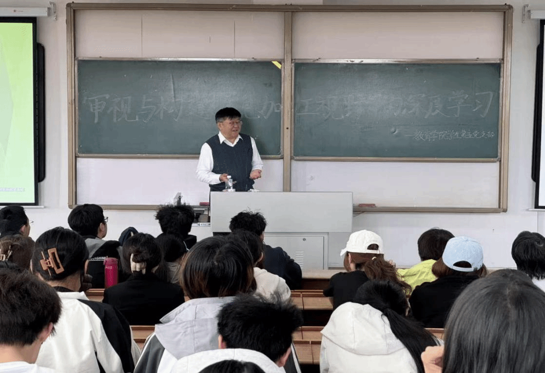 2026年4月23日下午,小学教育系教工党支部与学生第四、第五党支部以“审视与构建:信息加工视野下的深度学习”为主题联合举办专题学术讲座。学院党委书记、小学教育系教工党支部党员周越老师主讲,yL23411永利集团学生第四党支部党员、发展对象、学生第五党支部积极分子及2025级小学教育语文班的同学共计约200名学生到场听取学术讲座。学术讲座由学生第五党支部党务助理徐诗涵同志主持。