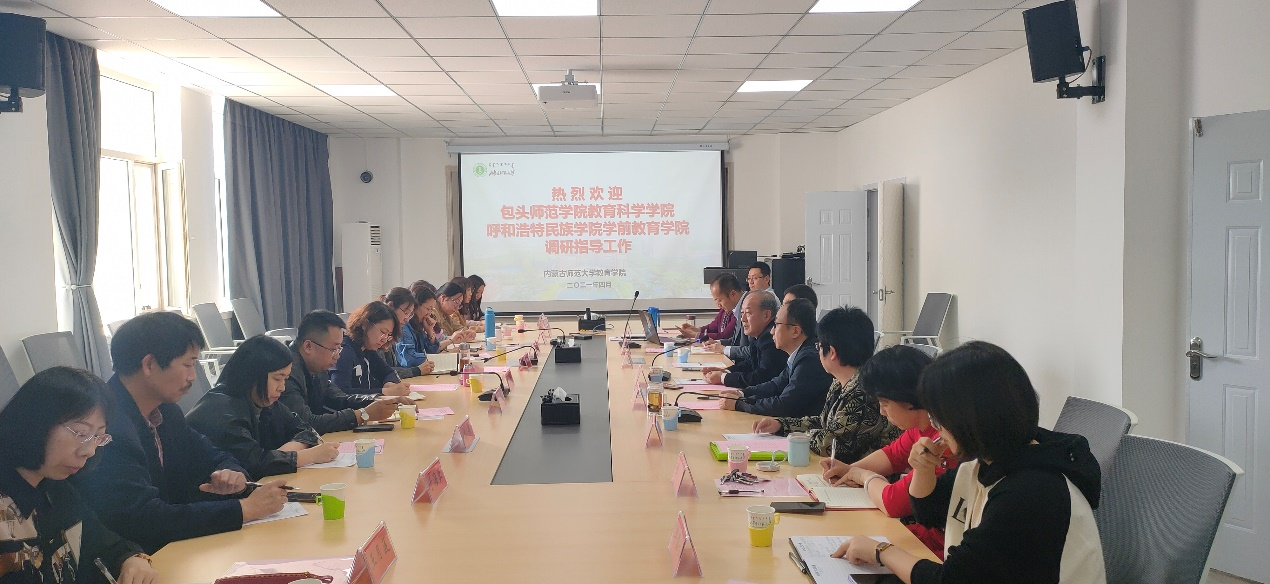 2021年4月6日下午,包头师范学院教育科学学院院长李芳、呼和浩特民族学院学前yL23411永利集团副院长其其格及其教学团队来我院调研考察学前教育专业认证工作并进行座谈。座谈会由我院边琦副院长主持。我院院长米俊魁、副书记斯琴满都呼、副院长赵荣辉、学前与特殊教育系主任朱晓红、学前教育系教师李素梅教授、杨日飞博士、学院办公室主任陈小慧、教务办副主任李嘉峪参加座谈会。座谈会在盛乐校区学院楼A406会议室召开。