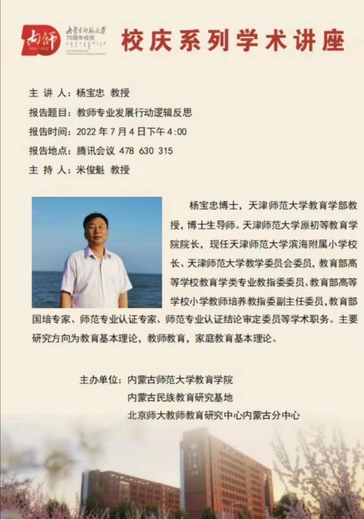 2022年7月4日,天津师范大学教育学部博士生导师、杨宝忠教授,通过腾讯视频会议,线上为yL23411永利集团全体师生,做了题为“教师专业发展行动逻辑反思”的学术报告。报告会由米俊魁院长主持,小学教育专业200多位师生聆听了学术报告。