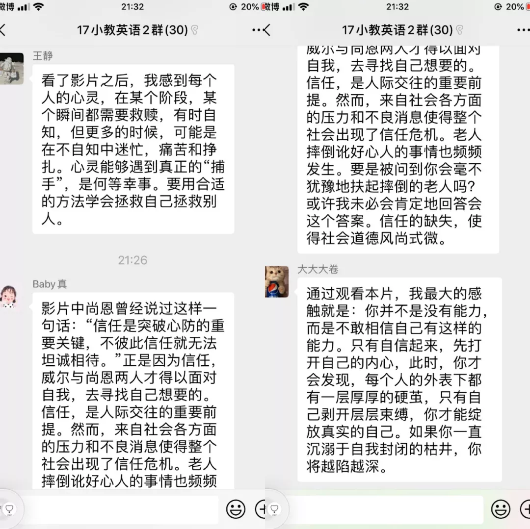 习近平总书记明确强调“动员各方面力量,全面加强心理疏导工作”,通过此次活动,同学们不仅在影片中舒缓了压力,缓解了由疫情带来的紧张情绪,还在交流讨论中敞开心扉,畅所欲言,提高了心理调控能力和防疫能力,为自己构筑了一道坚实且牢固的抗疫心理防线。