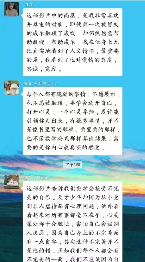 威尔是不幸的,他的童年有太多苦难,但他又是幸运的,他的身边有爱他的人,尚恩、查克、桑恩,他们都是威尔的好朋友,是威尔的救赎者,影片最后一帧的草原公路,远远地通向天边,洁净而又新鲜,也预示了威尔会有一个更好的人生。
