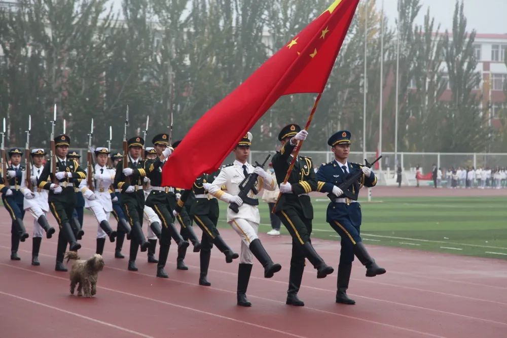 国旗手们昂首挺胸,英姿飒爽。护旗手护卫着神圣的国旗,动作整齐划一大步向前。国旗随风飘扬,我院师生共同唱响国歌。