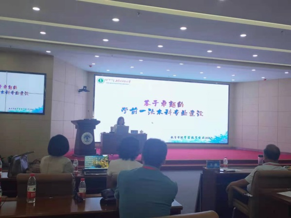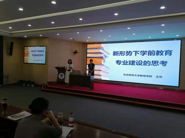 王萍作了《新形势下学前教育专业建设的思考》的主旨报告。王教授从百年间学校样态的变化出发,引发未来我们的教育需要培养什么样的人,强调在师范专业认证理念的指导下,从通识课程、专业核心能力课程、全程实践课程、专业技能课程等方面加强学前教育课程建设,推动“学生中心”的教学方式、多元化的考核评价的教学改革。