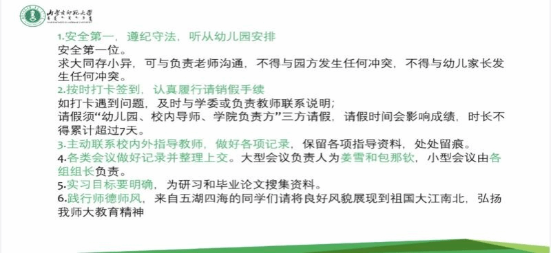 会议最后,于洋老师对实习期间的各项注意事项进行详细说明,强调了教师责任的三重维度,并为实习生们答疑解惑。