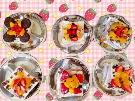 烘焙课就是其中之一。每周二会指派5位小朋友从家里带来食材,上午会带他们去烘焙教室做好吃的。印象最深的是这次做草莓蛋糕🎂