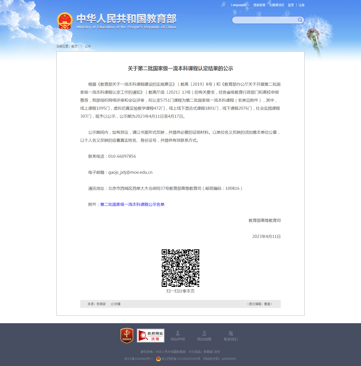 4月11日,教育部发布第二批国家级一流本科课程认定结果名单,由我院边琦教授作为课程负责人建设的《现代教育技术应用》入选国家级线上线下混合式一流课程。