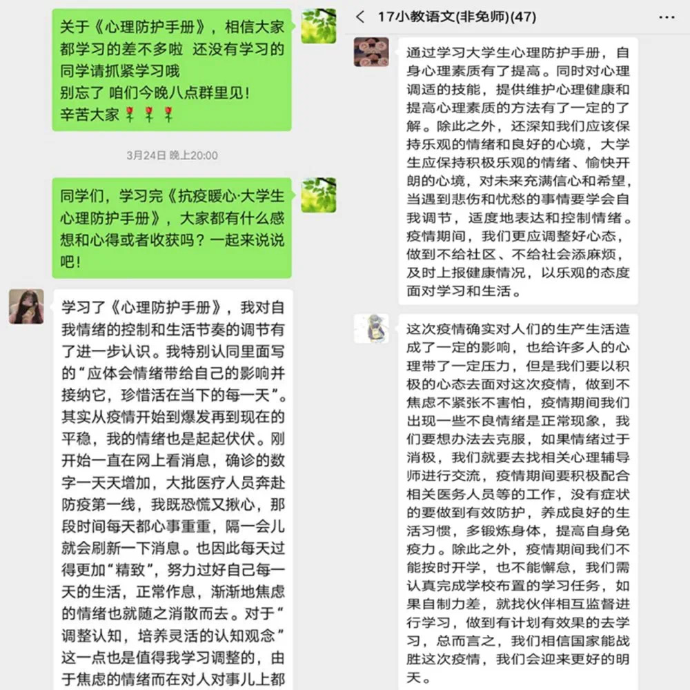 我班成功开展线上学习手册内容,还在微信平台进行关于心理健康问题的讨论。