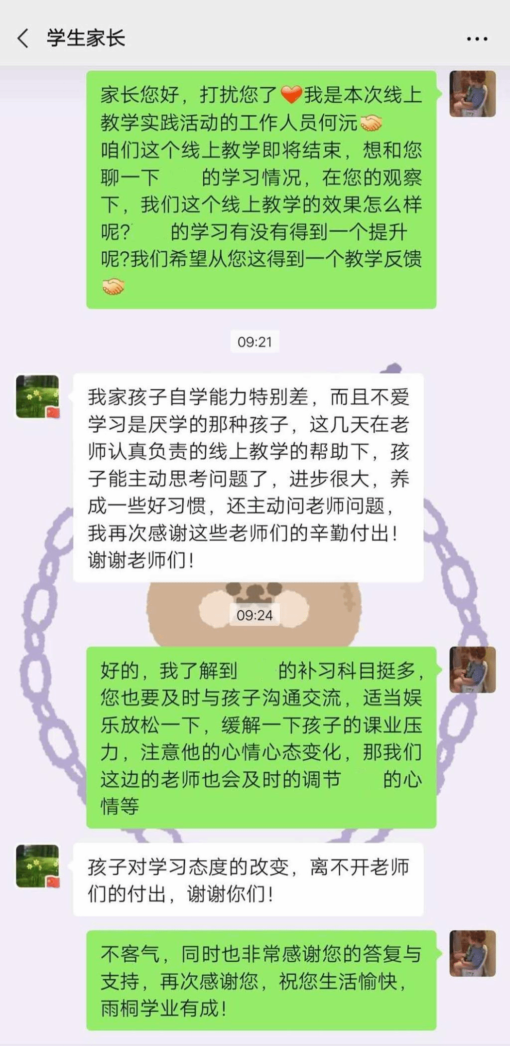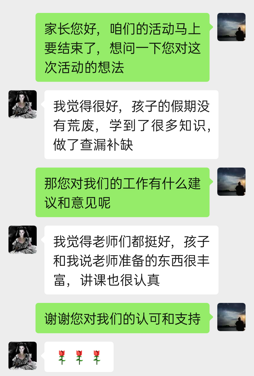 此次与家长的沟通,让我们进一步从不同角度了解了教学开展的效果。与此同时,我们的教学也得到了家长的认可与信任,让我们更有信心完成最后几天的教学工作。
