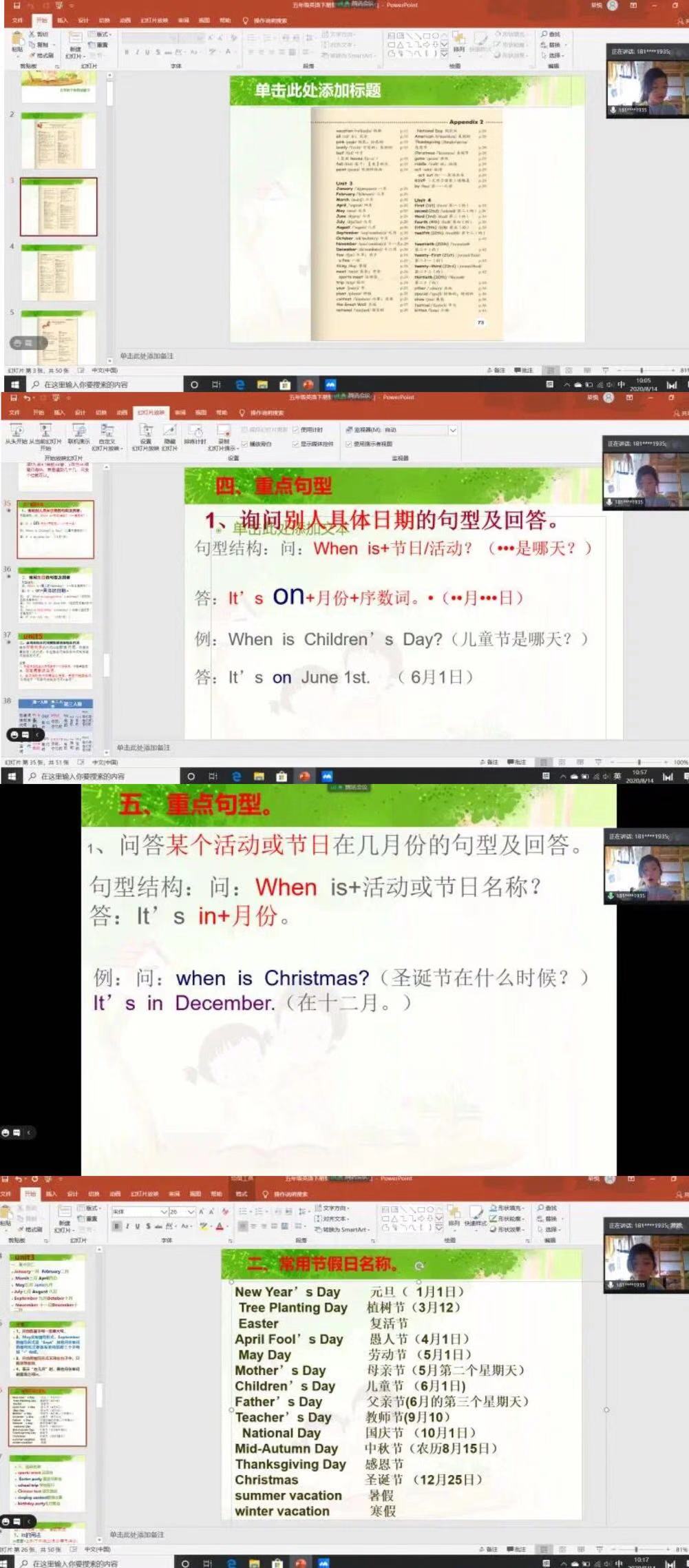 首先检查了同学的作业,完成得很认真,并且对于单词的各种形式也基本掌握。本节课依然是复习课,复习的内容是英语五年级下册第三及第四单元。由于之前讲错题进行过铺垫,所以今天的讲课进程稍快。首先带读各单元单词,然后进行重点句型的讲解,今天的重点句型是询问节日,生日,并且进行回答。以做对话的形式加深记忆,促进掌握。同时为同学介绍了叙述词变化的口诀,以及一些常见的节假日。根据在做对话中体现出来的问题,进一步复习了主语,谓语和be动词。