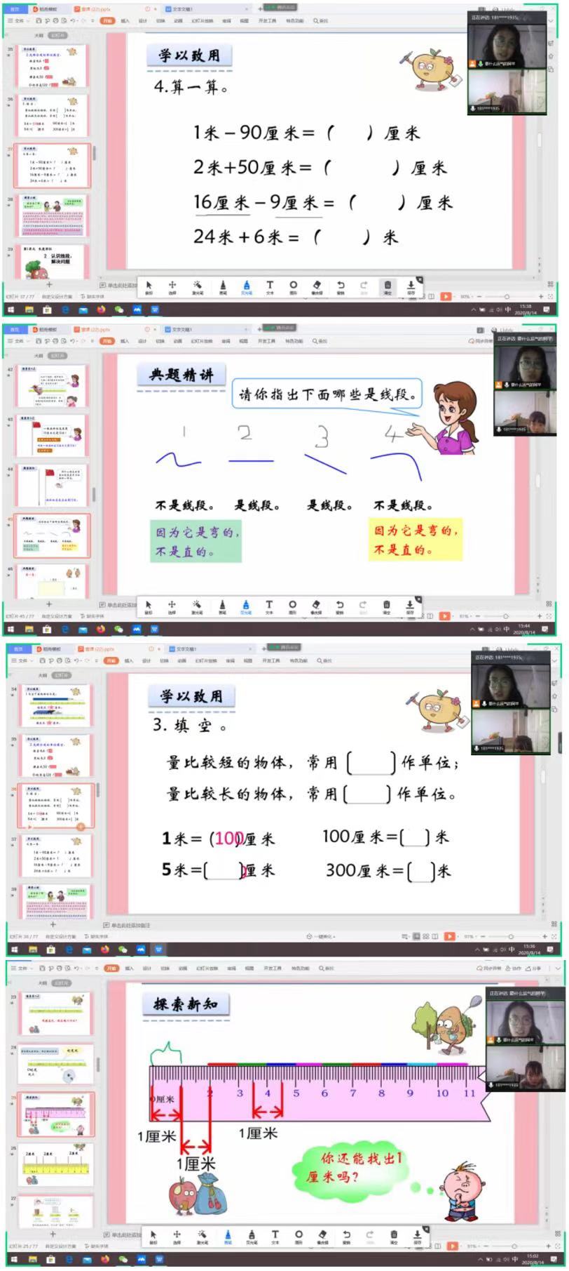 今天的内容是对上节课内容的继续,是关于小学二年级数学一单元的知识点。包括对米和厘米的应用与辨别,举了很多我们在生活中就能常常接触到的列子,达到了预期的效果。还包括认识线段以及线段的辨别。今天是第三次课,我能明显感受到小廖同学和我之间的互动在向着好的方向改变,我相信接下来会更好!