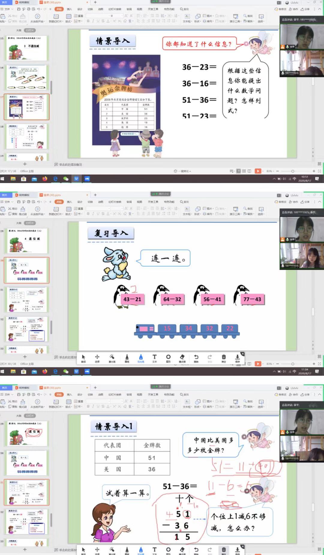 今天的主要内容是一百以内的减法,分两部分内容。第一部分是一百以内普通的减法,另一种是一百以内的退位减法。今天的重难点是退位减法。首先做了一些减法的题,作为本次内容的导入,然后以2008年获得金牌数前五的国家以及相对应的奖牌数作为已知条件来引导小廖同学自发举例,后我再借着她的问题来引导她进行减法的竖式计算。在刚接触退位减法时,小廖同学明显有着些许不能理解,但是在多次的举例计算之后,她能够自己独立进行退位减法的运算并且结果正确。且由于她课上独立的运算基本正确,本次课便没有留下课后练习。
