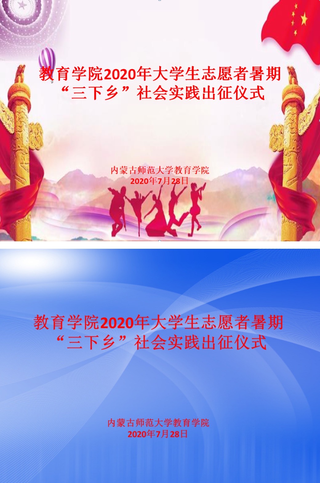 2020年7月28日晚上,我院举办了暑期云端三下乡社会实践活动出征仪式。提前一天,我们信息技术指导组着手制作出征仪式所需定屏。我制作了两版初稿。
