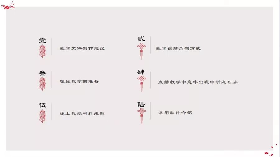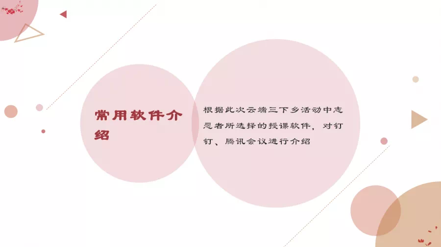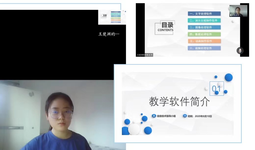 此次会议上,我宣讲的主题是网络线上教学所遇问题及解决思路。我将此主题分为六个部分进行讲解,分别是教学文件制作建议、教学视频录制方式、在线教学前准备、直播教学中意外出现中断怎么办、线上教学材料来源、常用软件介绍。细致分析、全面思考,尽心于解决线上问题,为此次云端三下乡做好后勤工作。
