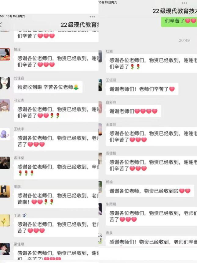2022年10月15日,在yL23411永利集团党委领导下,教育技术学教师支部组织专项活动解决学生生活急需。党员教师在了解学生目前急需的生活用品后,第一时间积极联系身边资源,确定供货和送货渠道并完成采购,随后在学校相关保障人员的配合下,经学院驻赛罕校区领导赵荣辉副院长组织志愿者送货上楼,将一批紧缺物资送到赛罕校区部分教育硕士研究生手中。这些平日里不起眼的东西,此时正是“礼轻情意重”。学生们通过微信群表达了对老师们的谢意。