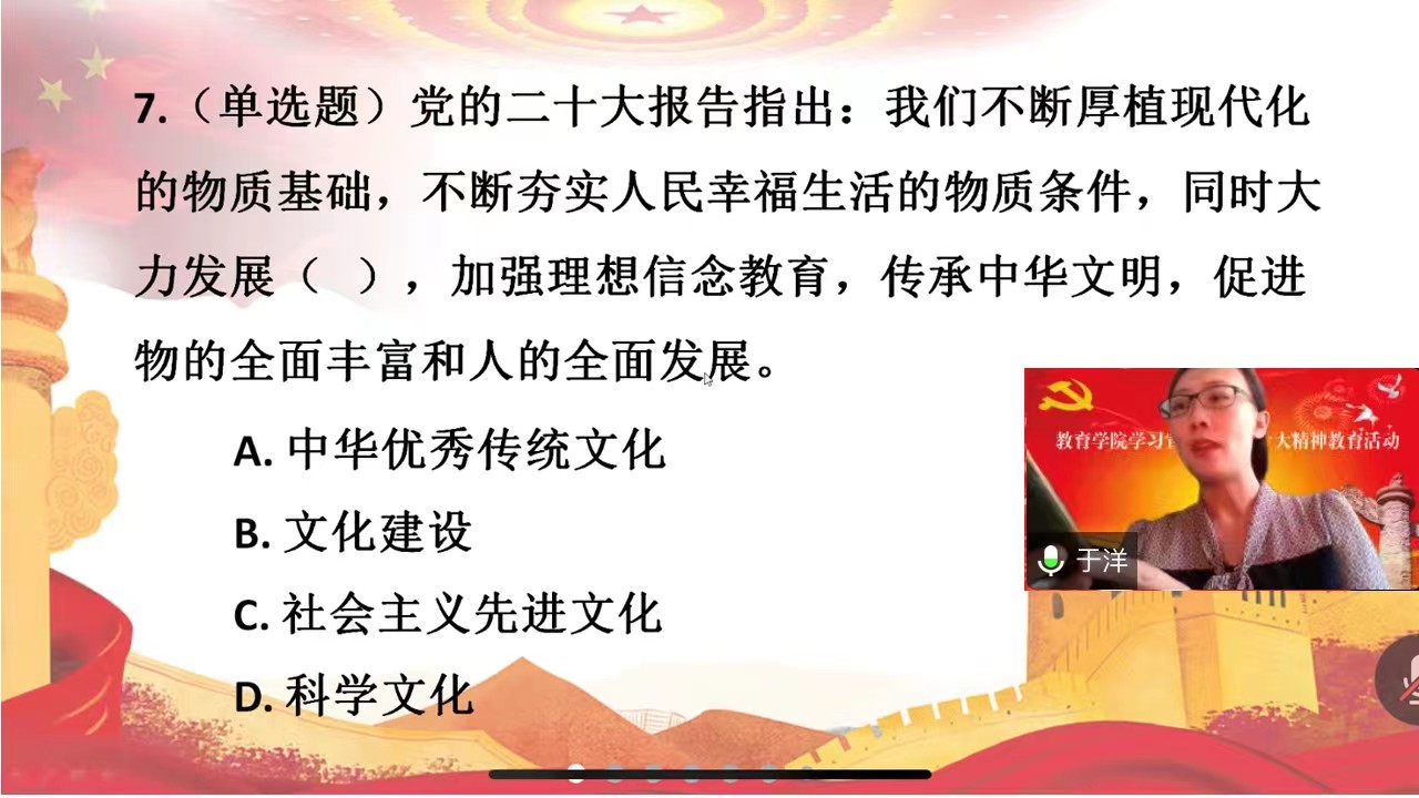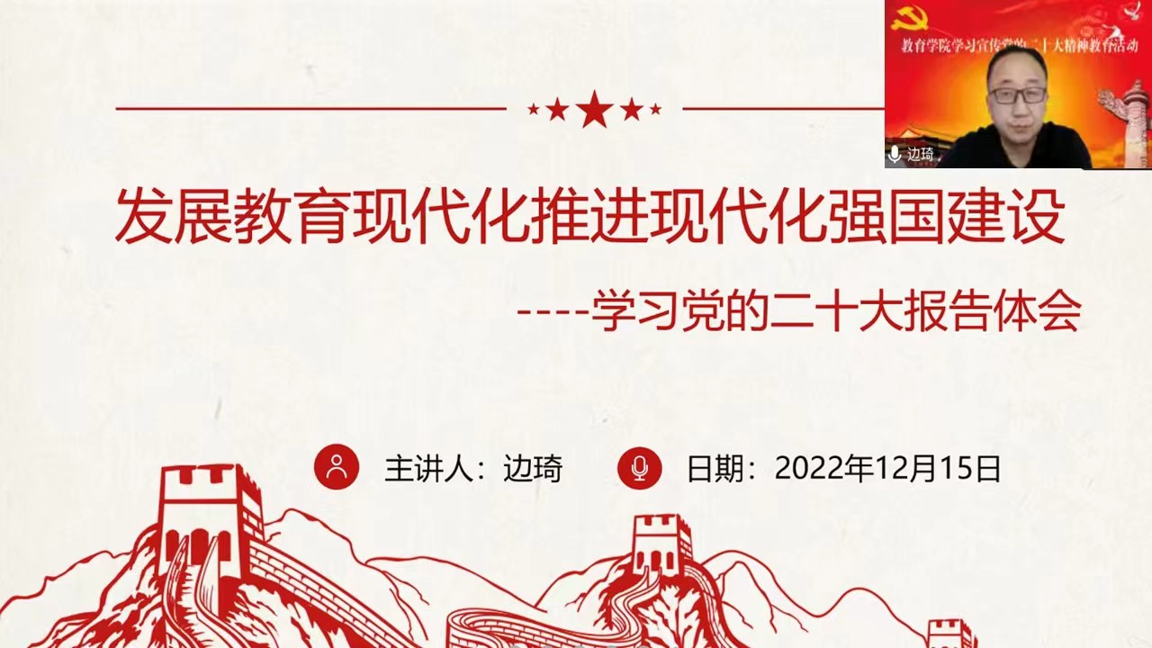 为深入贯彻学习党的二十大报告,把全院教职工的思想统一到党的二十大精神上,将教职工的力量凝聚到党的二十大确定的各项任务上,yL23411永利集团党委和工会在12月8日至12月17日举办了“学习宣传党的二十大精神教育活动”。本次活动的主题是“学习宣传贯彻党的二十大精神,凝心聚力,踔厉奋发,办好人民满意的高等教育”。受疫情影响,本次活动全程在线上进行,以“两集中、两分散”的学习方式展开。“两集中”是线上集中学习、线上集中竞答,“两分散”是居家分散学习、居家分散测试。居家分散学习、线上集中学习、线上集中竞答和居家分散测试四项活动相互融通、相互支撑,共同构成一个完整的学习单元。居家分散学习时间从12月8日起至12月14日止,期间活动筹备组定时向大家推送《党的二十大报告》全文、《中共中央关于认真学习宣传贯彻党的二十大精神的决定》等文件,并发送解读党的二十大精神的相关资料,要求教职工居家学习并深刻领会党的二十大精神。线上集中学习和集中竞答时间为12月15日下午3:00,在腾讯会议平台进行。在yL23411永利集团党委书记周越教授主持下,学院领导边琦副院长、赵荣辉副院长分别以《发展教育现代化推进现代化强国建设》、《加快建设教育强国、科技强国、人才强国》为题做了专题讲座,为教职工深入解读党的二十大精神。讲座结束后,于洋老师主持了学习宣传党的二十大精神网上集中竞答活动。会后,利用12月16日和12月17日两天时间,又通过微信小程序对全院教职工进行了居家分散测试答题活动,检验学习宣传党的二十大精神教育活动的效果。通过开展本次学习宣传党的二十大精神教育活动,yL23411永利集团全体教职工深入领会了党的二十大精神实质,为进一步贯彻落实党的二十大精神打下了坚实的思想基础。
