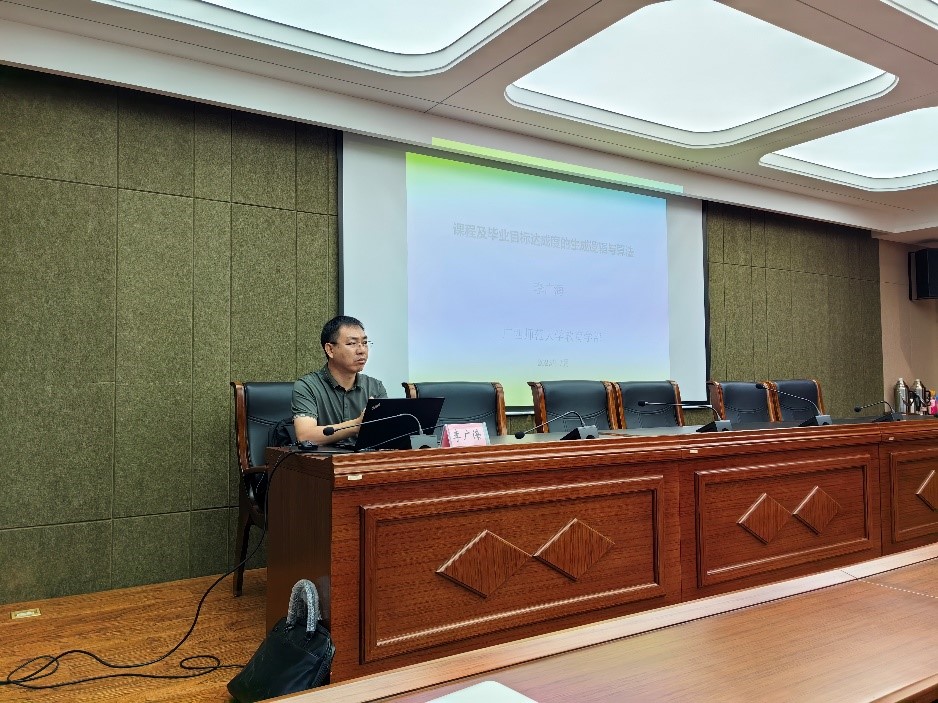 8月27日上午,广西师范大学教育学部副部长、博士生导师李广海教授应我院邀请,对我院教师进行课程目标达成度计算专项培训。李广海教授兼任中国教育战略发展学会教育法治专业委员会常务理事、中国成人教育协会教师教育培训专业委员会副理事长、中国学前教育研究会学前教育管理专委会委员、广西教育政策与法治研究专业委员会秘书长。培训会由杨日飞副院长主持。院长赵荣辉、副院长边琦、系部主任、各系专任教师以及来自心理学院、历史文化学院等50多名教师参加了培训学习。