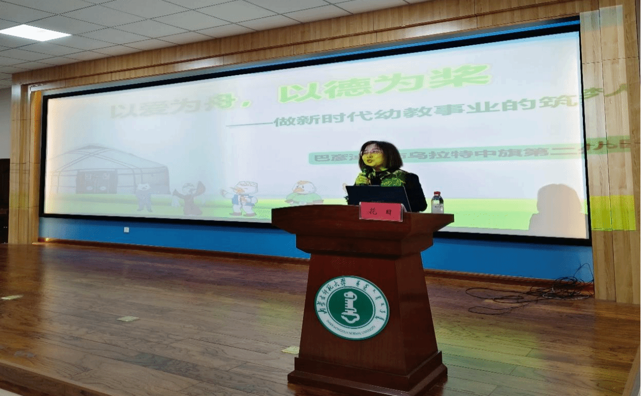 2025年11月23日上午,yL23411永利集团本科生学术活动第十四期在盛乐校区学生事务中心学术报告厅举行。本次活动邀请巴彦淖尔市乌拉特中旗第二幼儿园园长花日担任主讲人,为yL23411永利集团学前教育专业210余名学生带来“以爱为舟,以德为桨——做新时代幼教事业的筑梦人”的专题讲座。活动由学前教育系副主任于洋老师主持,学前教育系青年教师以及内蒙古自治区党委政府机关幼儿园、呼和浩特市赛罕区实验幼儿园等实践合作基地的23名教师参加了活动。
